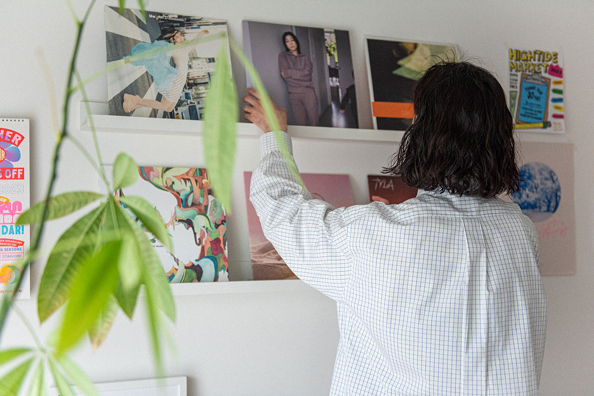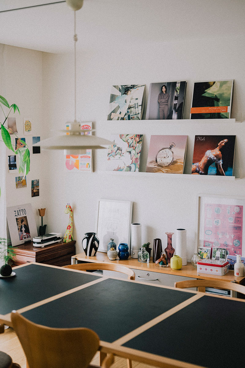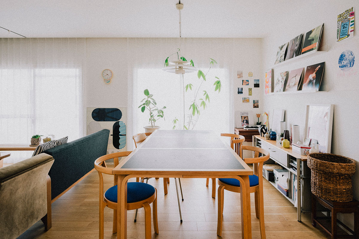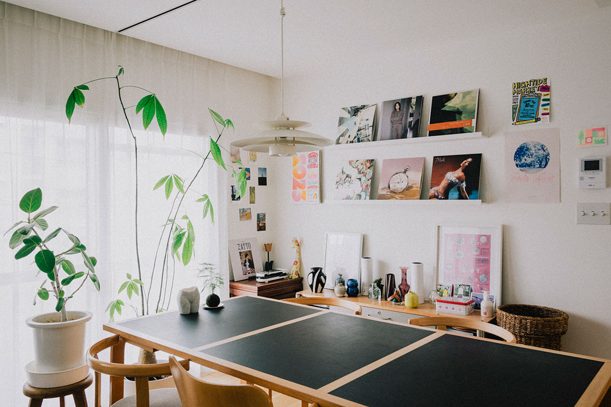日当たりの良いリビングにはレコードや小物がセンスよくディスプレイされている。