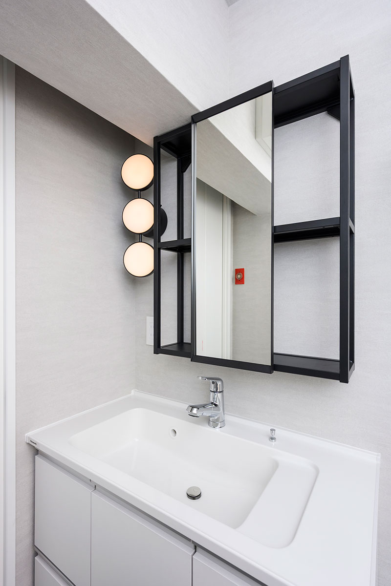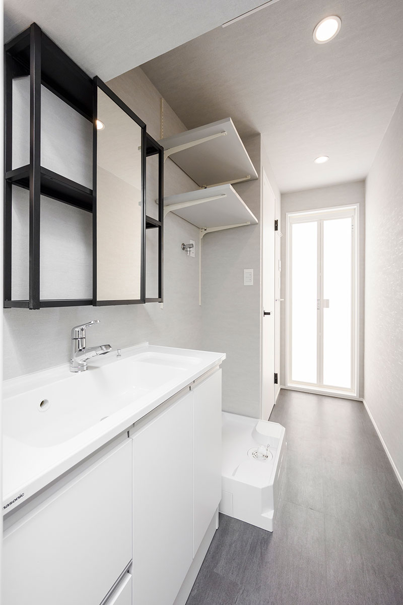 団地は洗面スペースの通路幅が狭く梁が大きいので、コンパクトな製品を使うことで開放的になります。