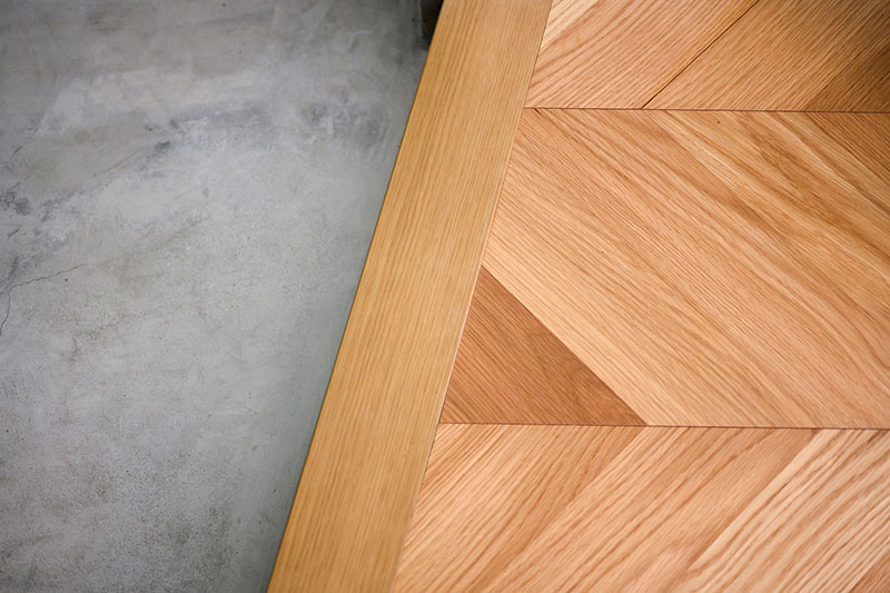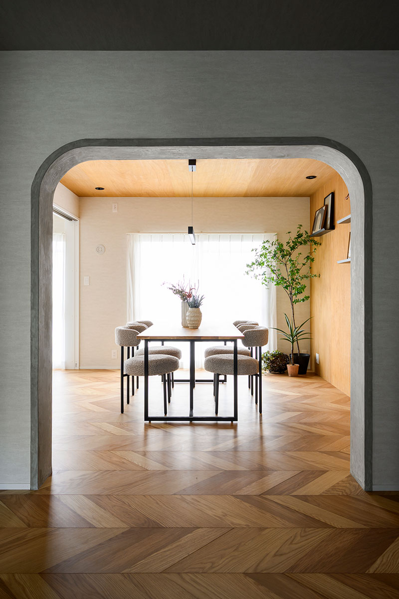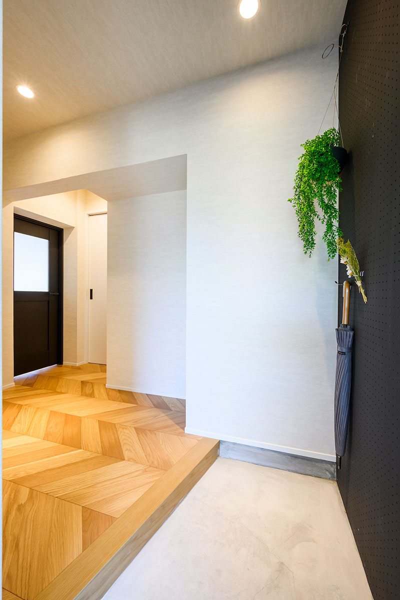 玄関はモルタル仕上げ、フローリングはリノベーションで人気の高いヘリンボーン柄です。