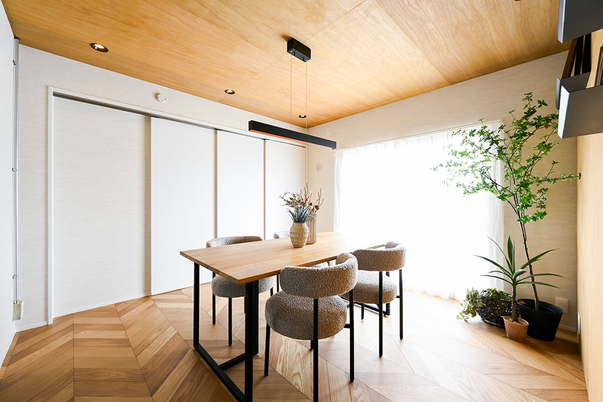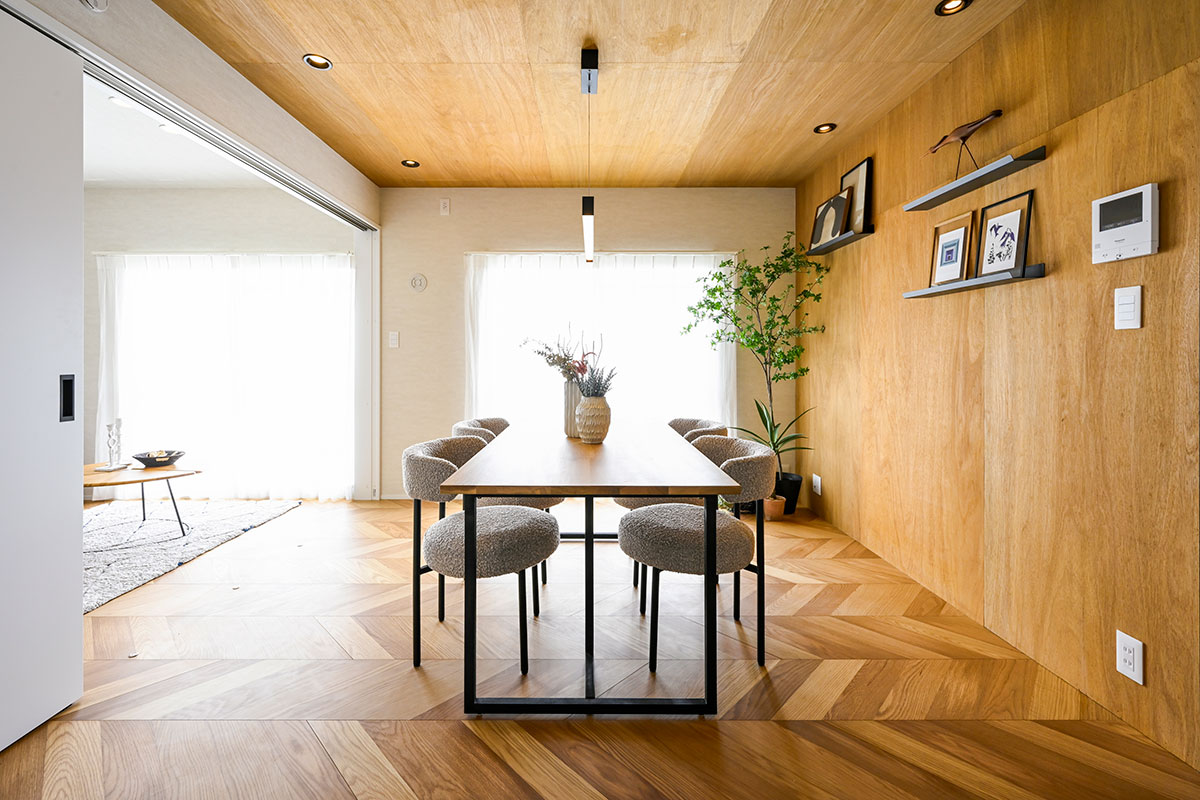 壁面と天井の一部にラワン合板を使用して、アシンメトリーな空間に仕上げました。