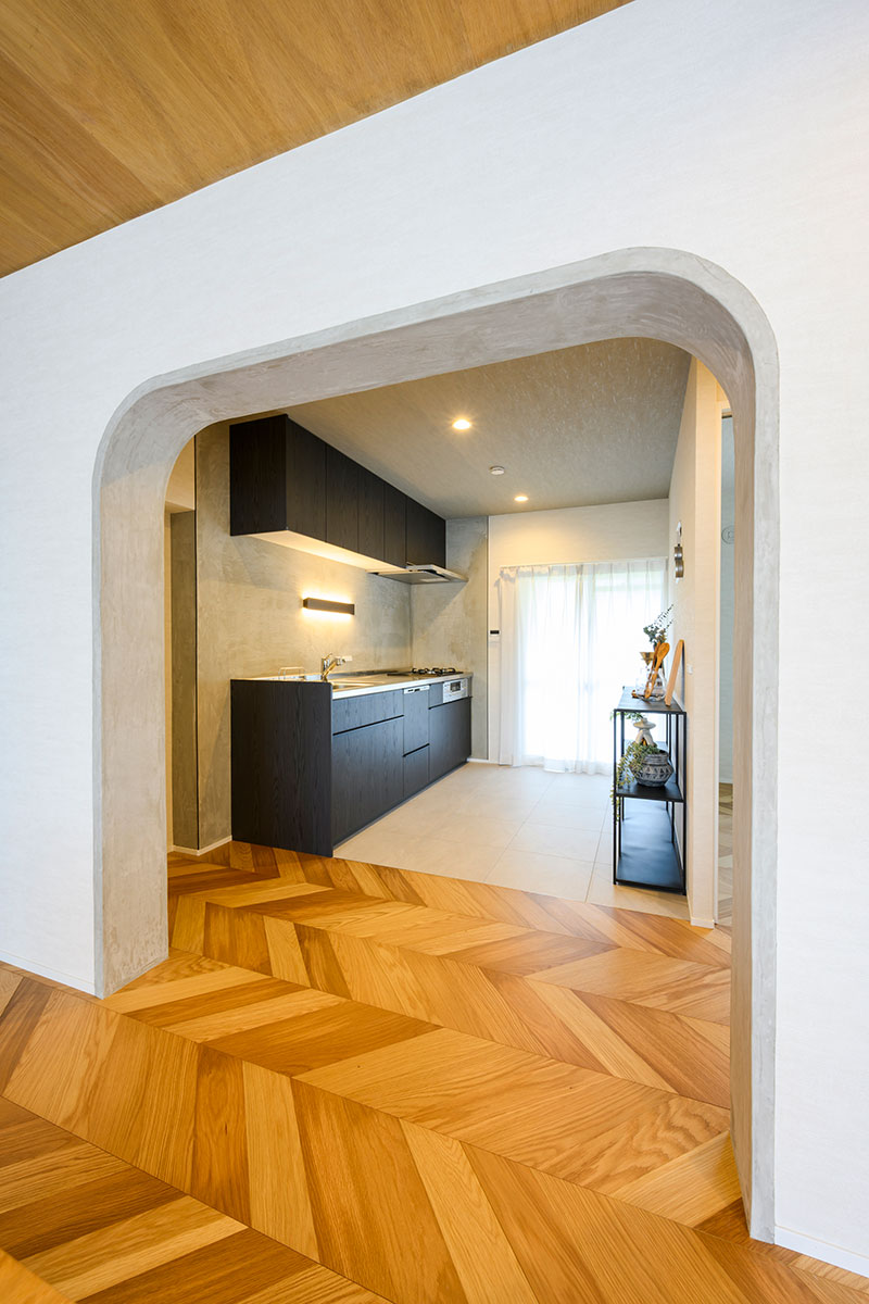 団地ならではのアーチ部分はモルタル仕上げにしました。躯体部は塗装が一般的ですが、
