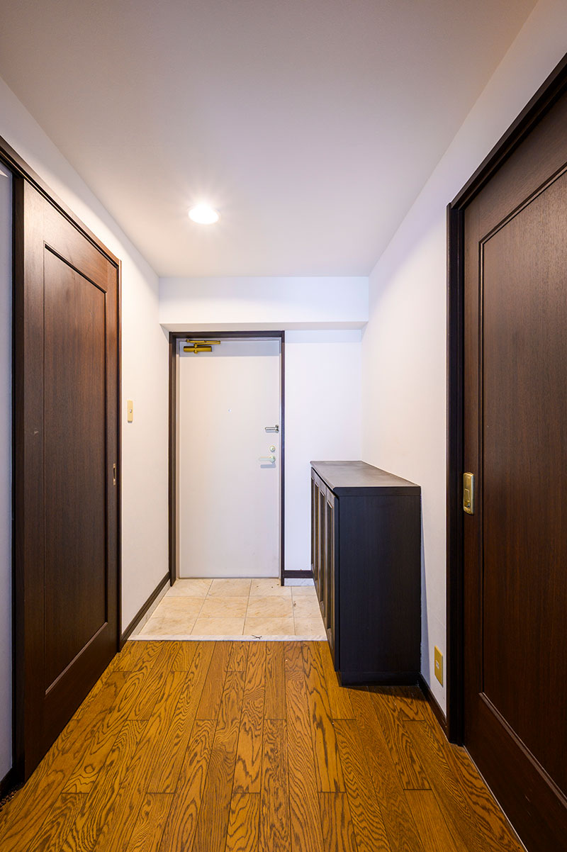 クロスはシンプルな白を基調としつつも、各居室のドアをアースカラーにしてデザイン性を高めました。キッチンやお風呂などの住宅設備も「これでいい」ではなく、むしろ「これがいい」というお客さま視点で選定。特に、玄関から見える場所にある洗面台は、リノベらしい造作にこだわりました。