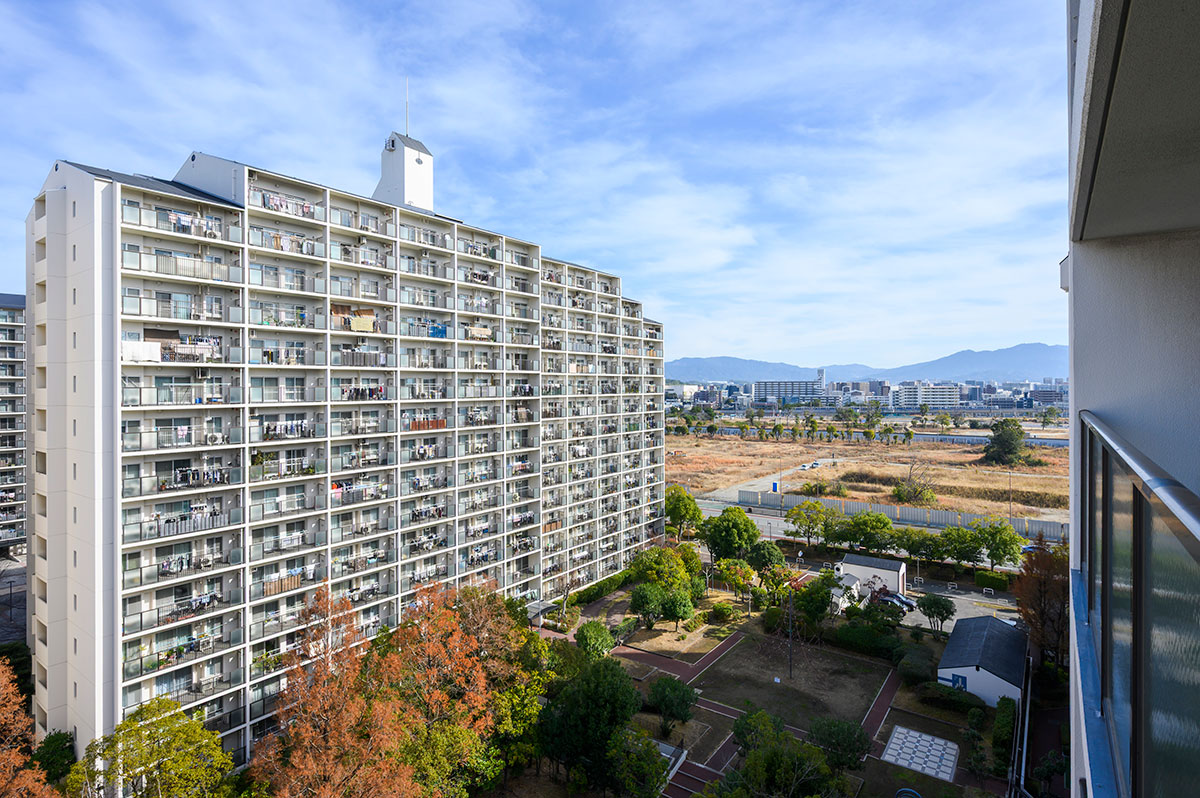今回ご紹介している「のむら貝塚ガーデンシティ」は、再開発エリアから見ると国道の向こう側に位置する、総戸数1,000戸を超える巨大なマンション群です。築30年ぐらいの建物で、ちょうどリノベ向きの年数となっています。当社でも、過去に何度も工事させていただきました。