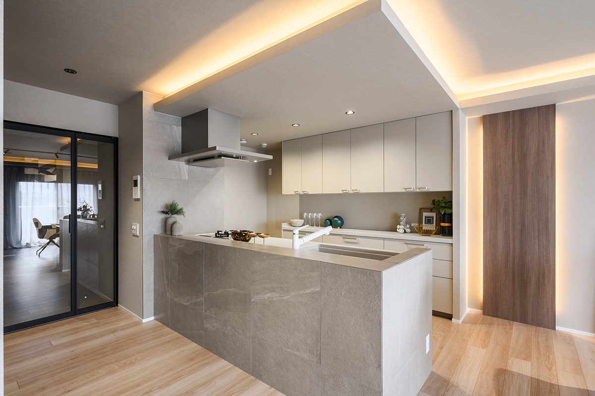 タイルで覆われた印象的な玄関ホールを抜けると、遮るものがないゆとりのリビング空間が広がります。優しい色目に統一されたリビングですが、キッチン周辺やテレビボード部背面に大判タイルを設置。効果的に配置された間接照明と相まって、ラグジュアリーな雰囲気を作り出しています。