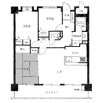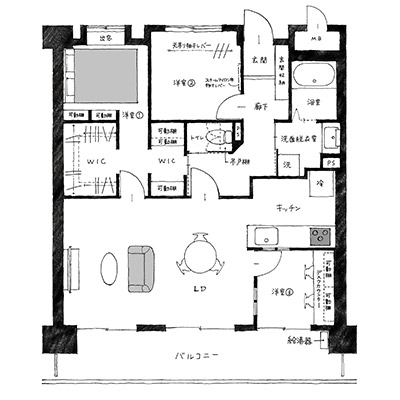71㎡サイズのマンションにしては珍しく、3面がバルコニーに面していたので、日中長く過ごすリビングとワークスペースを南側にレイアウト。