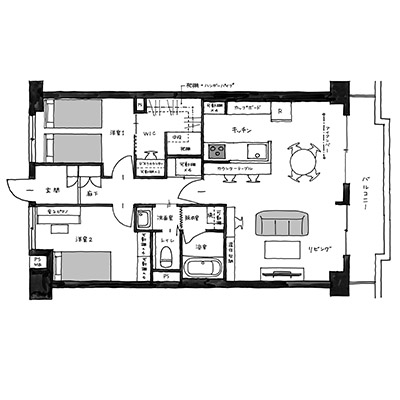 ご夫婦二人が気持ちよく暮らせるよう、南面のバルコニーに気持ちの良いリビング空間をレイアウトし、見せる収納をバランスよく配置しています。同時に、お二人がそれぞれの時間を楽しめるよう、予備の洋室や書斎スペースも確保し、毎日をストレスなく過ごせるお宅となりました。