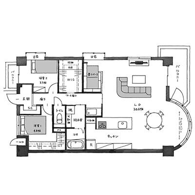 半円形のサンルーフが特徴的な物件で、日当たりの良い20.6畳のリビングが暮らしの中心となっています。また、リビングからは抜けの良い景観が楽しめるため、季節の移ろいを感じることができるのも大きな特徴でした。