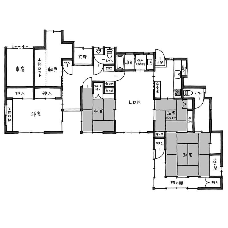 東区の人気駅まで徒歩圏内。194坪の土地に建つ築50年の戸建を、大規模にリノベーションされました。元々は2階建てだったお宅を前オーナーが平屋に減築していたのですが、さらに今回の工事で若いご家族が住みやすい間取りへと改装しました。