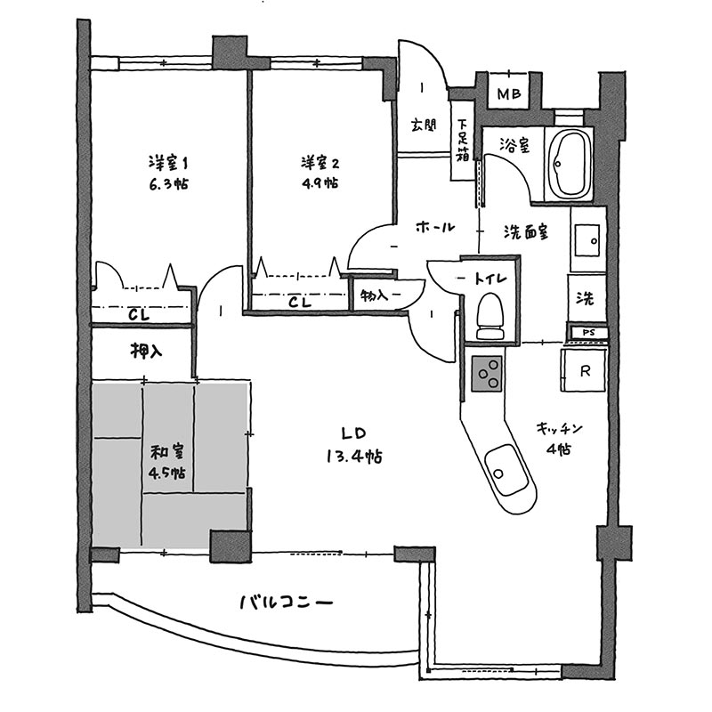 間取りをなんと表記すればいいのか、とっても難しいお宅です。リビングに隣接した「洋室2」は、写真を見ていただくと分かるように、壁の上部が開放されています。そのため、不動産会社によっては個室ではなく、リビングと見なすかも知れません。