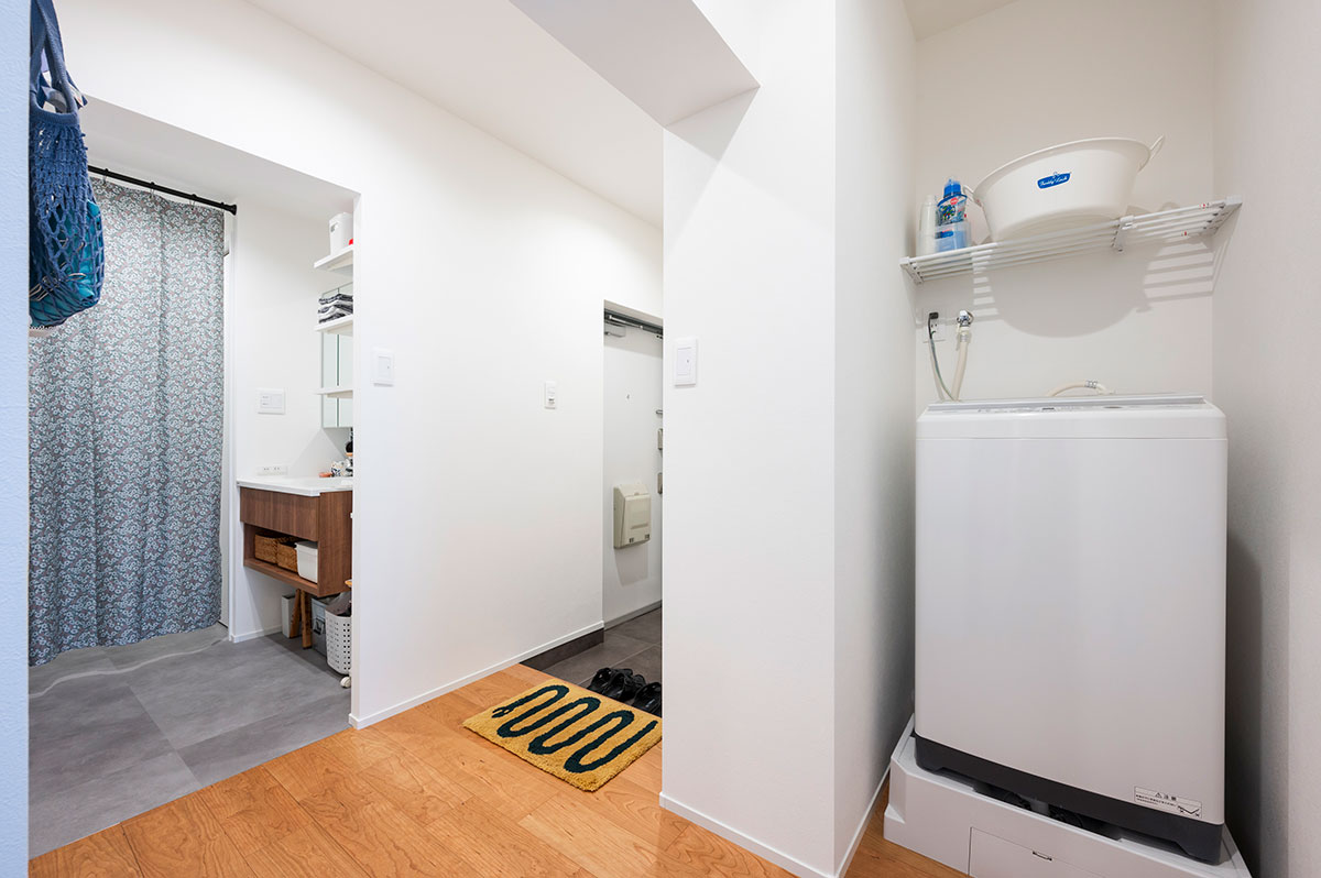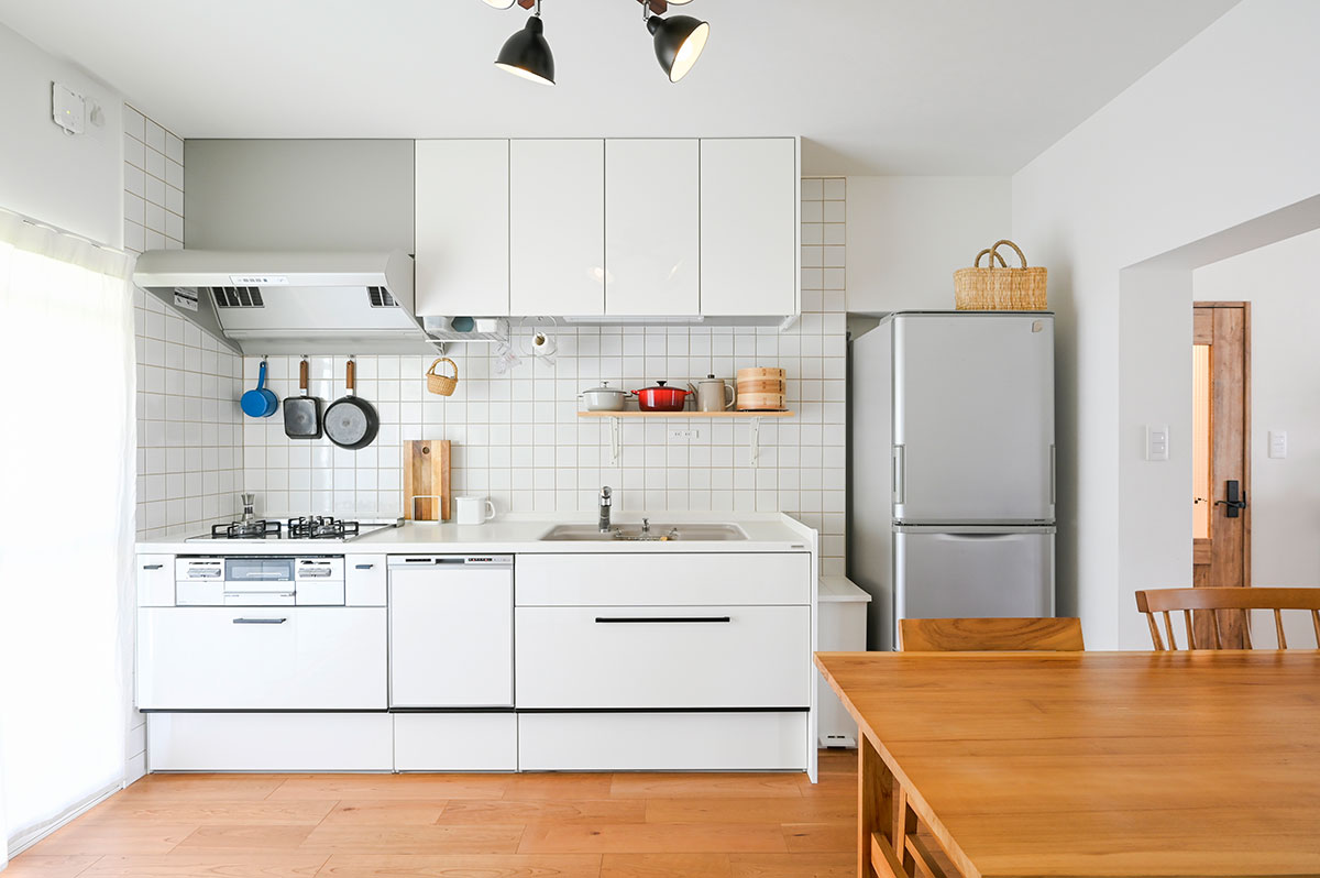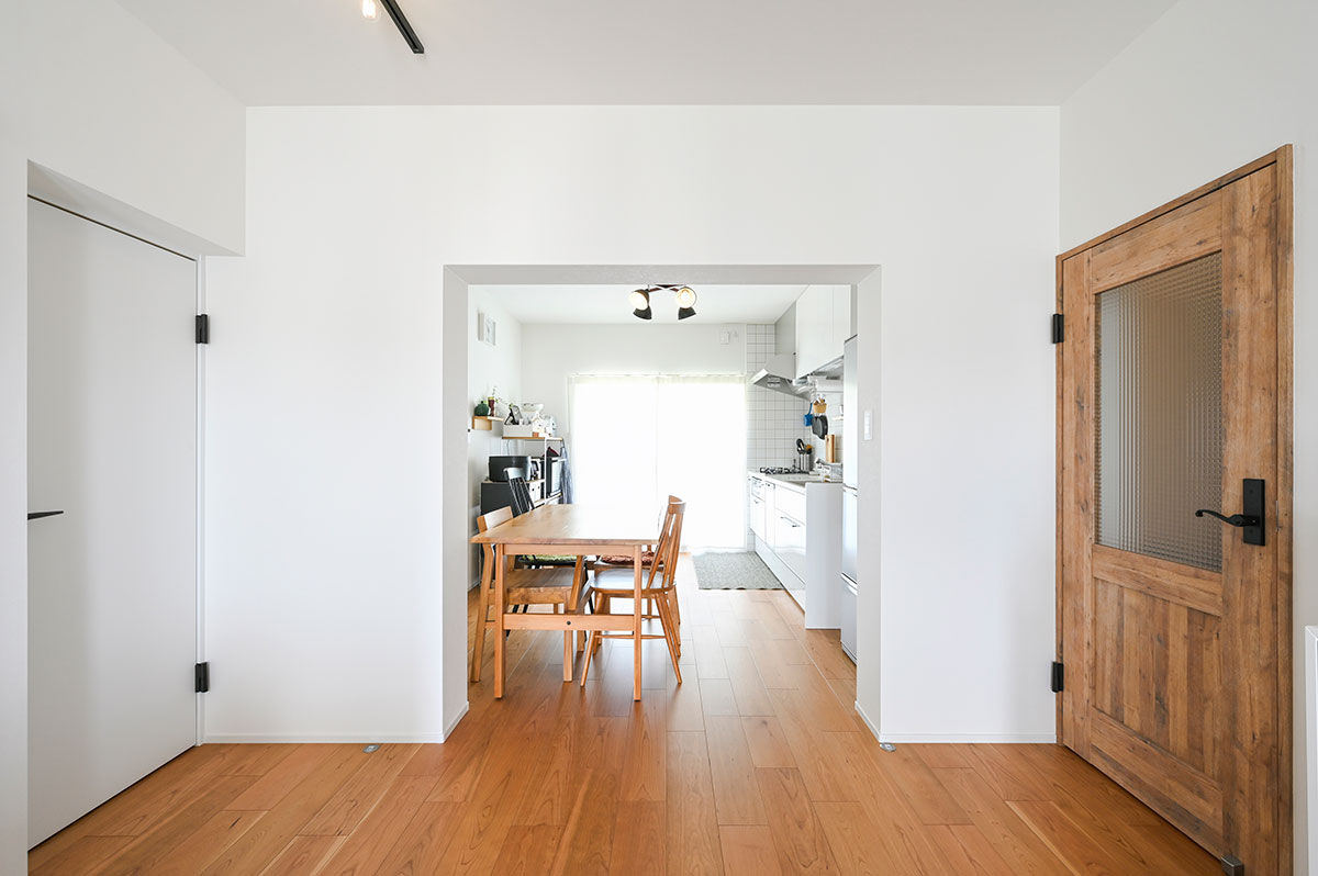 団地に多い壁式構造のため、大胆な間取り変更は難しい状況でした。それでも、白で統一されたシンプルなデザインと、設備や家具の配置を工夫することで、ゆとりのある空間が実現できています。また、洗濯機スペースを移動したことで、洗面や脱衣所も十分な広さが確保できました。