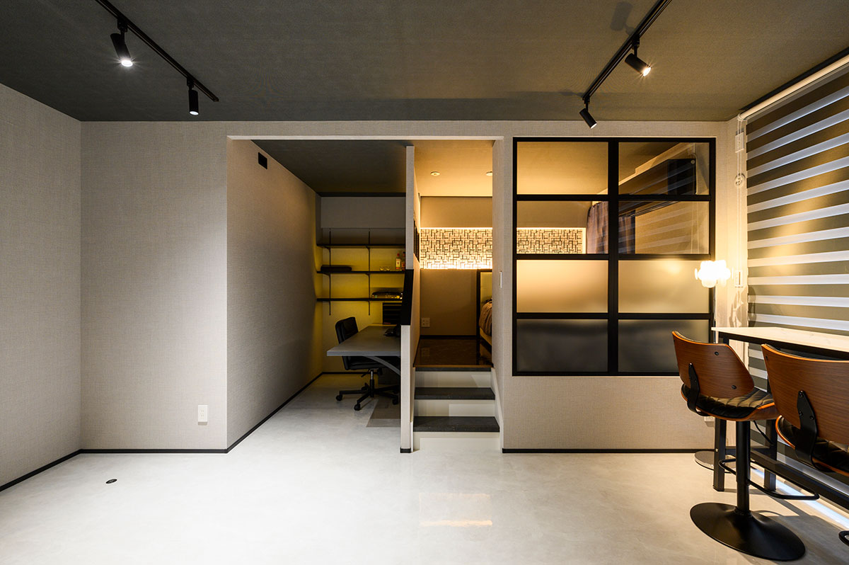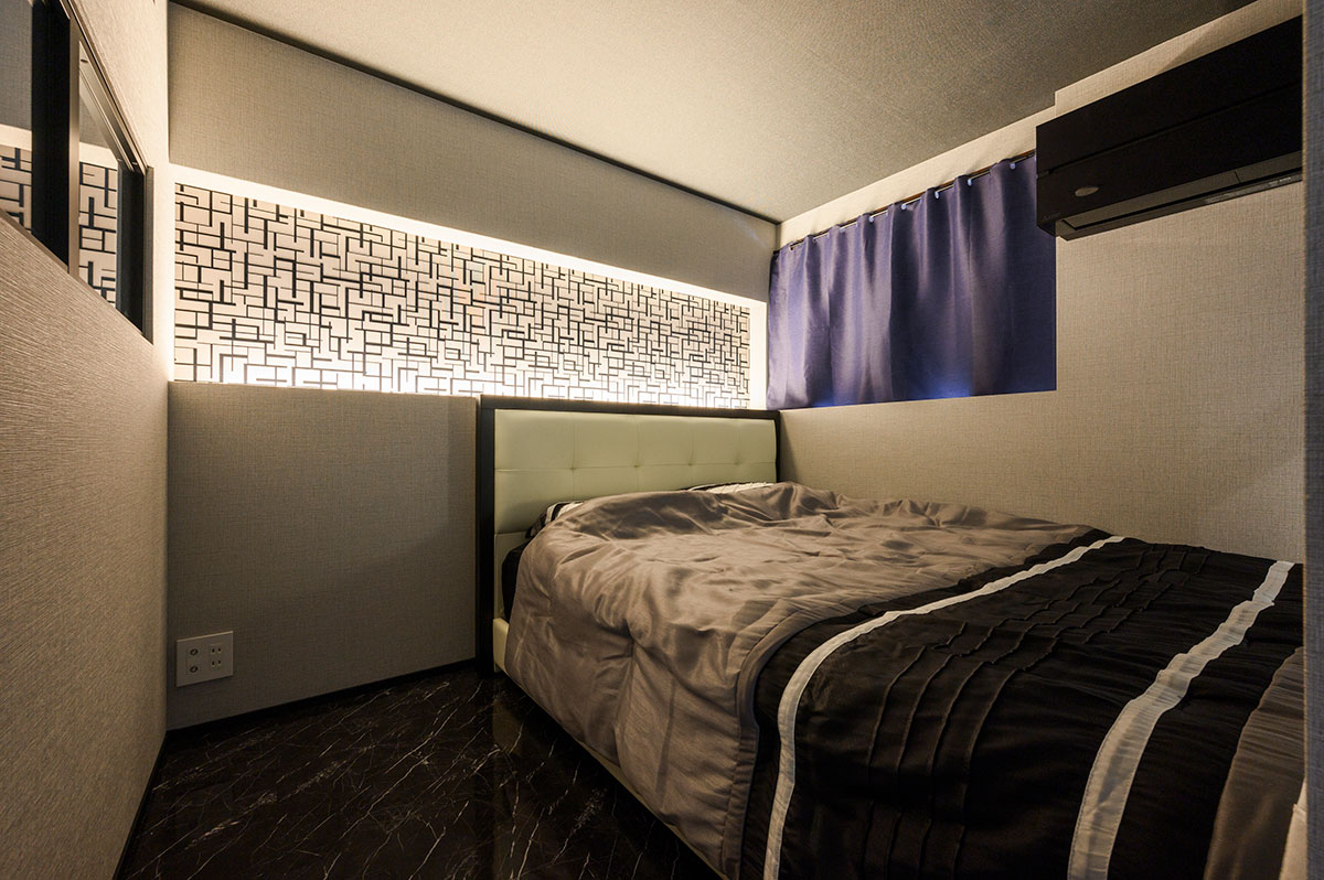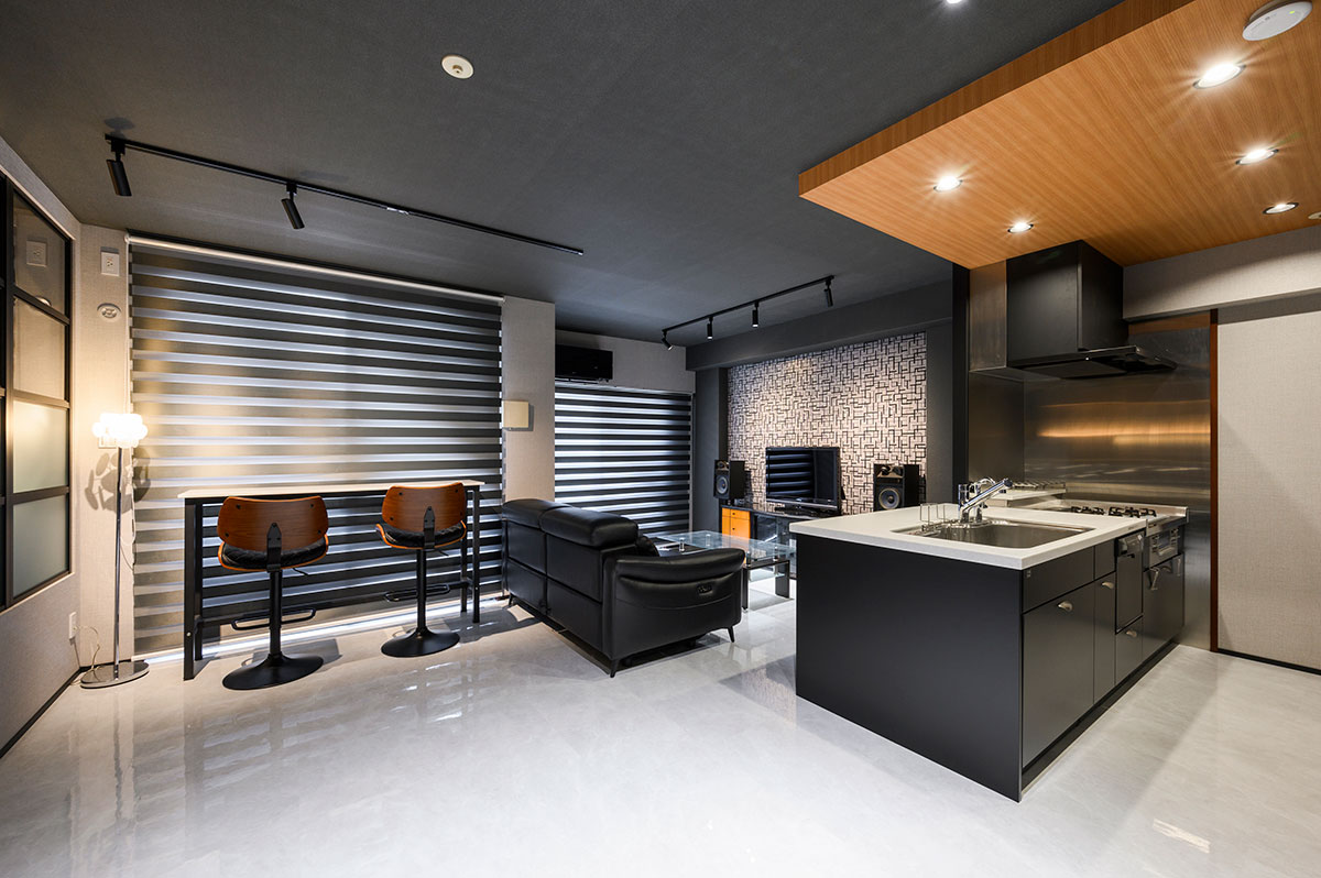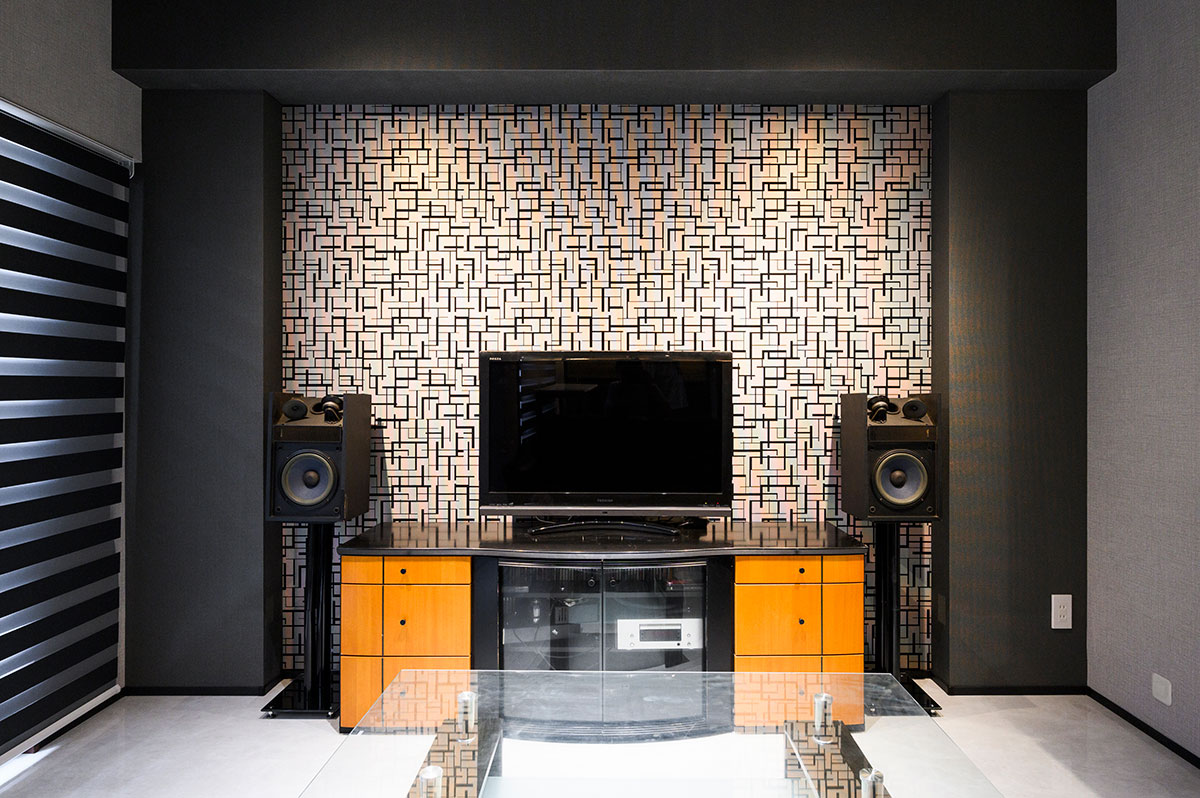 お部屋全体は、黒とグレーを基調に統一されたシックな空間に。キッチン天井の木目や、テレビ背面と寝室の一部に貼った幾何学模様のアクセントクロスが、大人の雰囲気を醸成。全体的に照度を落とした中に配置された間接照明が、さらに癒しの空間レベルをアップしています。