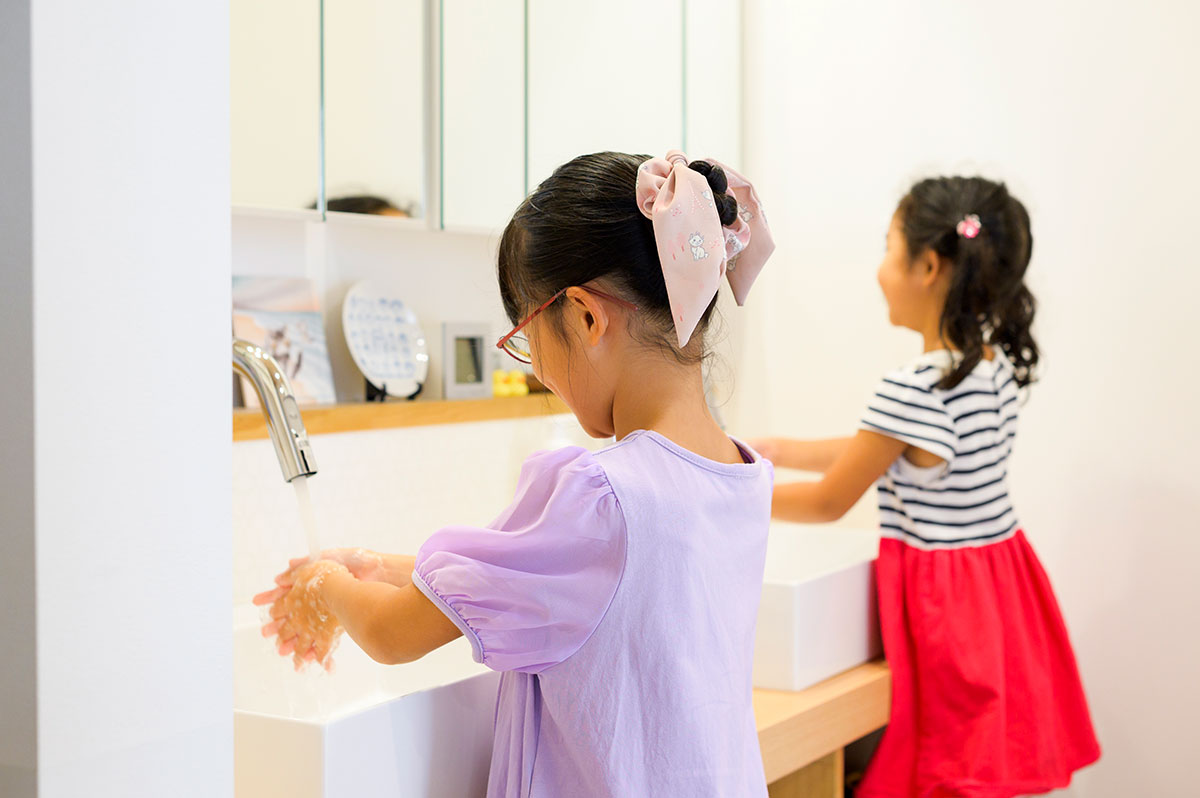 一番の特徴と言えるのは、キッチンに隣接した2つの洗面台です。2人同時に身支度ができるだけでなく、脱衣室と別にしたことで、パパにとっても3姉妹にとってもストレスが減りました。ダイニングスペース近くに洗面台があるため、子どもたちが手を洗う頻度も増えたそうです。