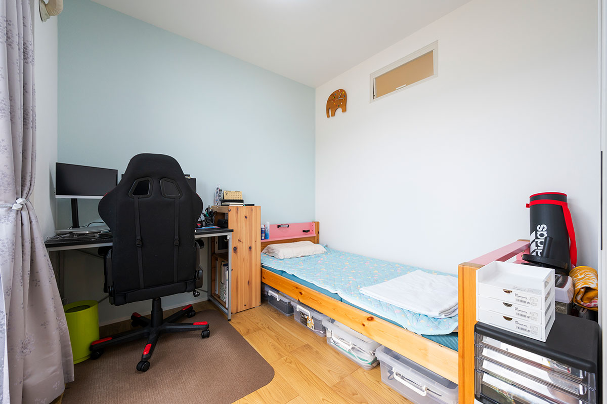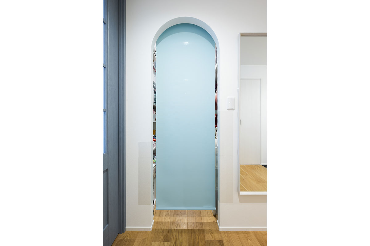 しかも、各個室からアクセスの良い場所に収納を配置したことで、洗濯後のお片付け動線も楽になりました。WICの入口アーチと水色のロールスクリーンが、訪れるお客さんにも「かわいい」と好評だそうです。