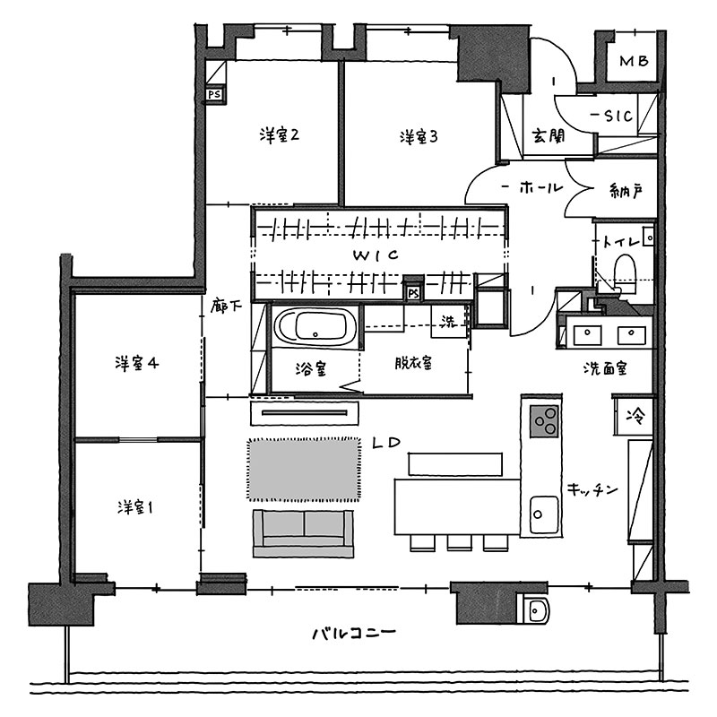 部屋数を増やすために、家の中心にWICを配置。それぞれの個室はサイズダウンしましたが、結果的にレイアウトがすっきりしたこともあり、リビングは狭さを感じません。