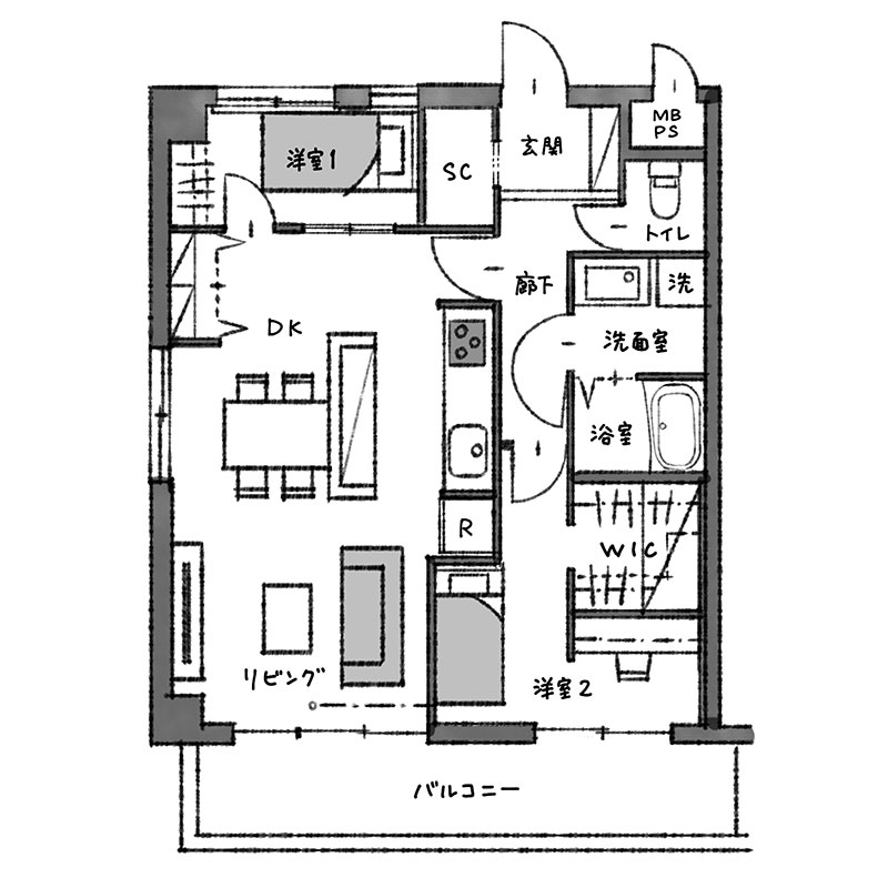 2つの個室を確保するには、60㎡というコンパクトなサイズが課題でしたが、そこは巧みなプランニングで解決。同時に、キッチンやカップボードを無垢製に統一することで、お好みの雰囲気を実現しました。