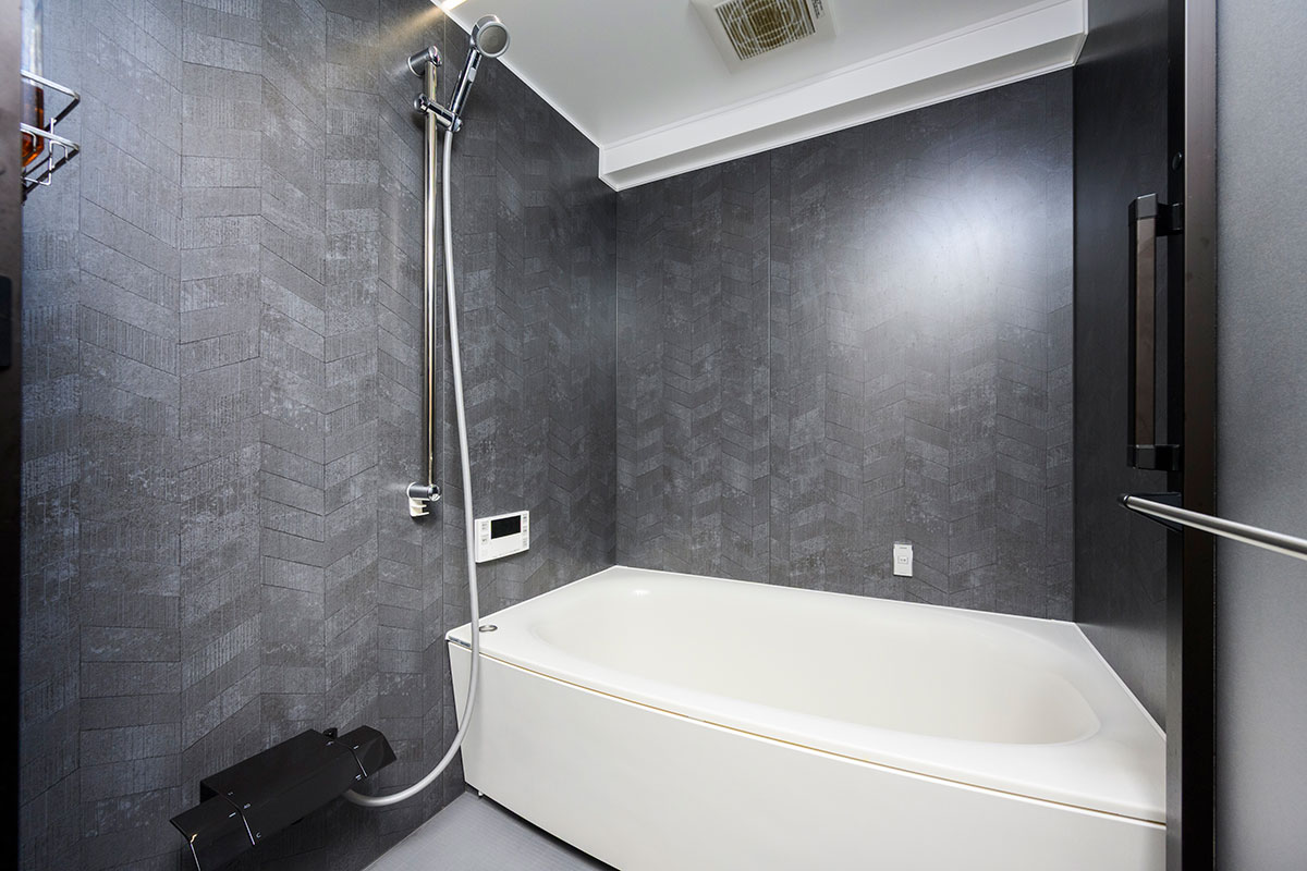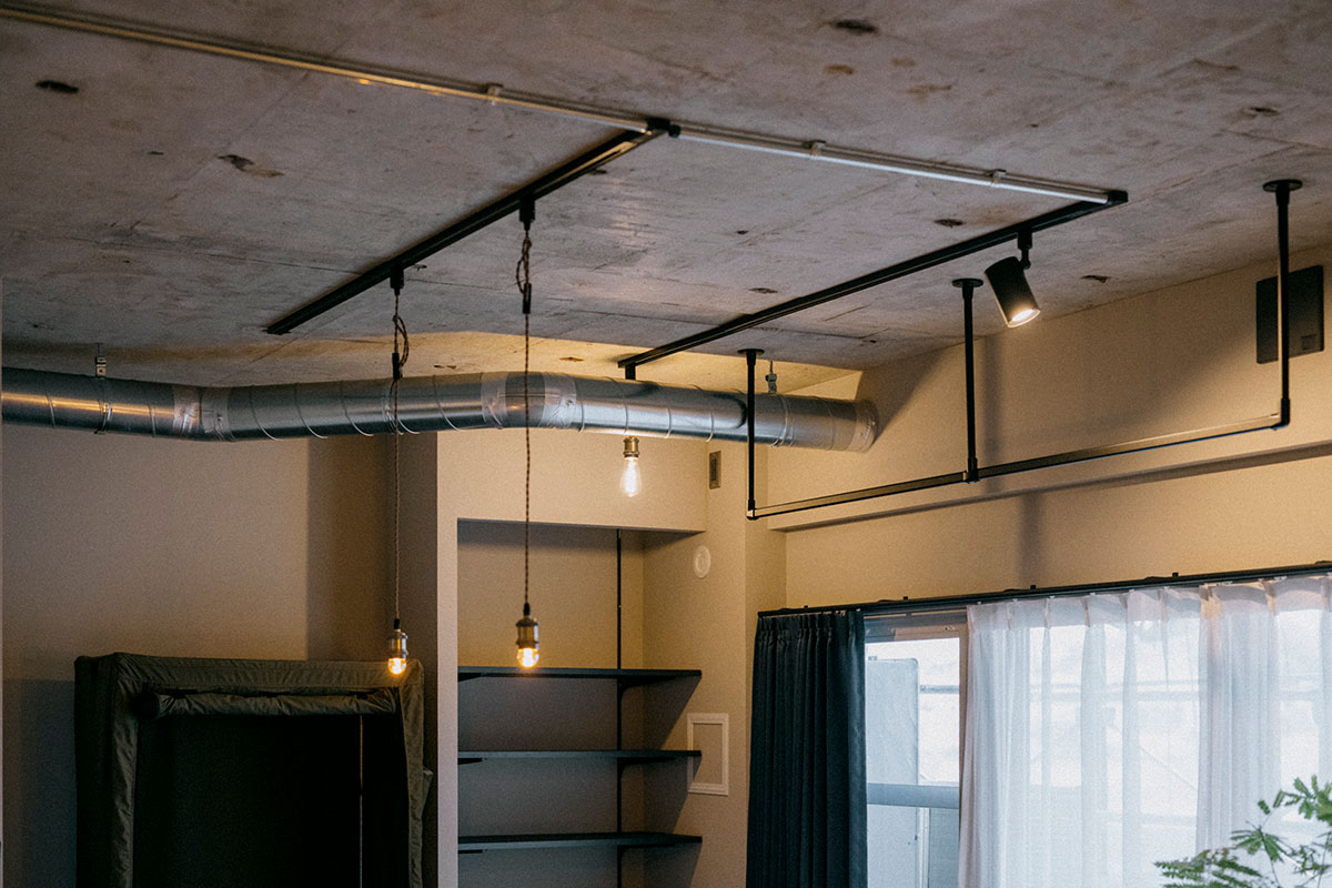 モルタルの天井、剥き出しの配管、トグルスイッチなど、リノベらしいオシャレなアイテムが随所に見られるお宅です。印象に残る廊下のヘリンボーン柄を、ユニットバスの壁面でも採用するなど、インテリア関係の仕事をされているご主人だけあって、ひとつずつのセレクトからセンスを感じられます。