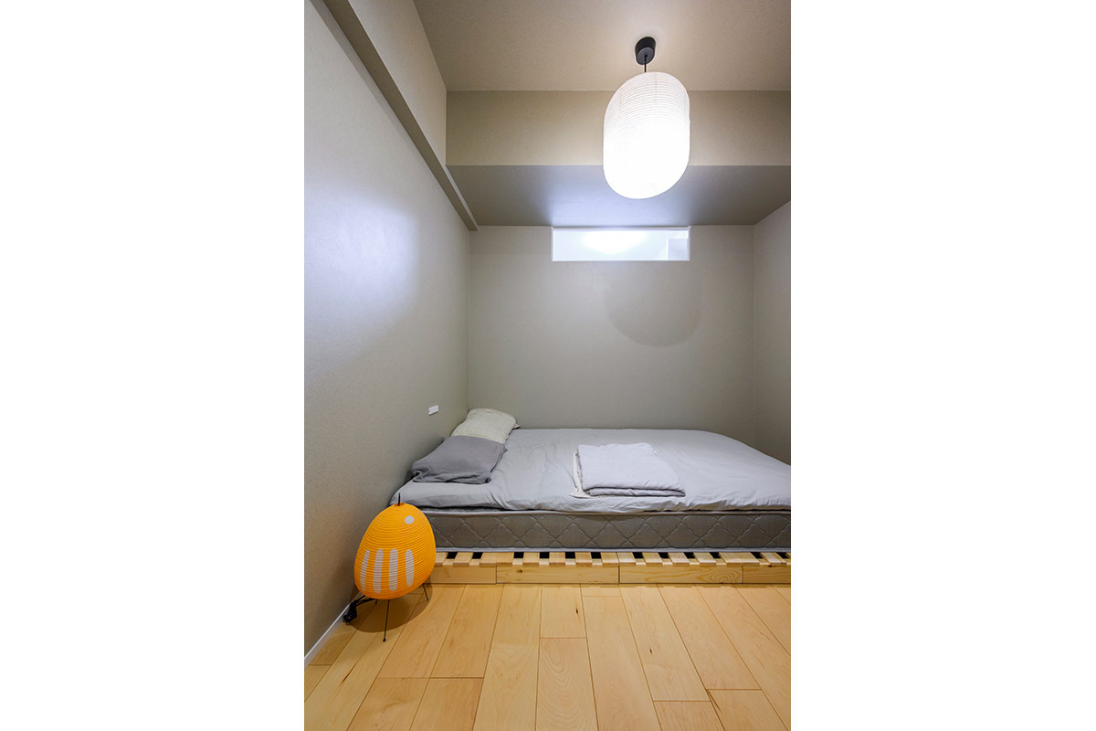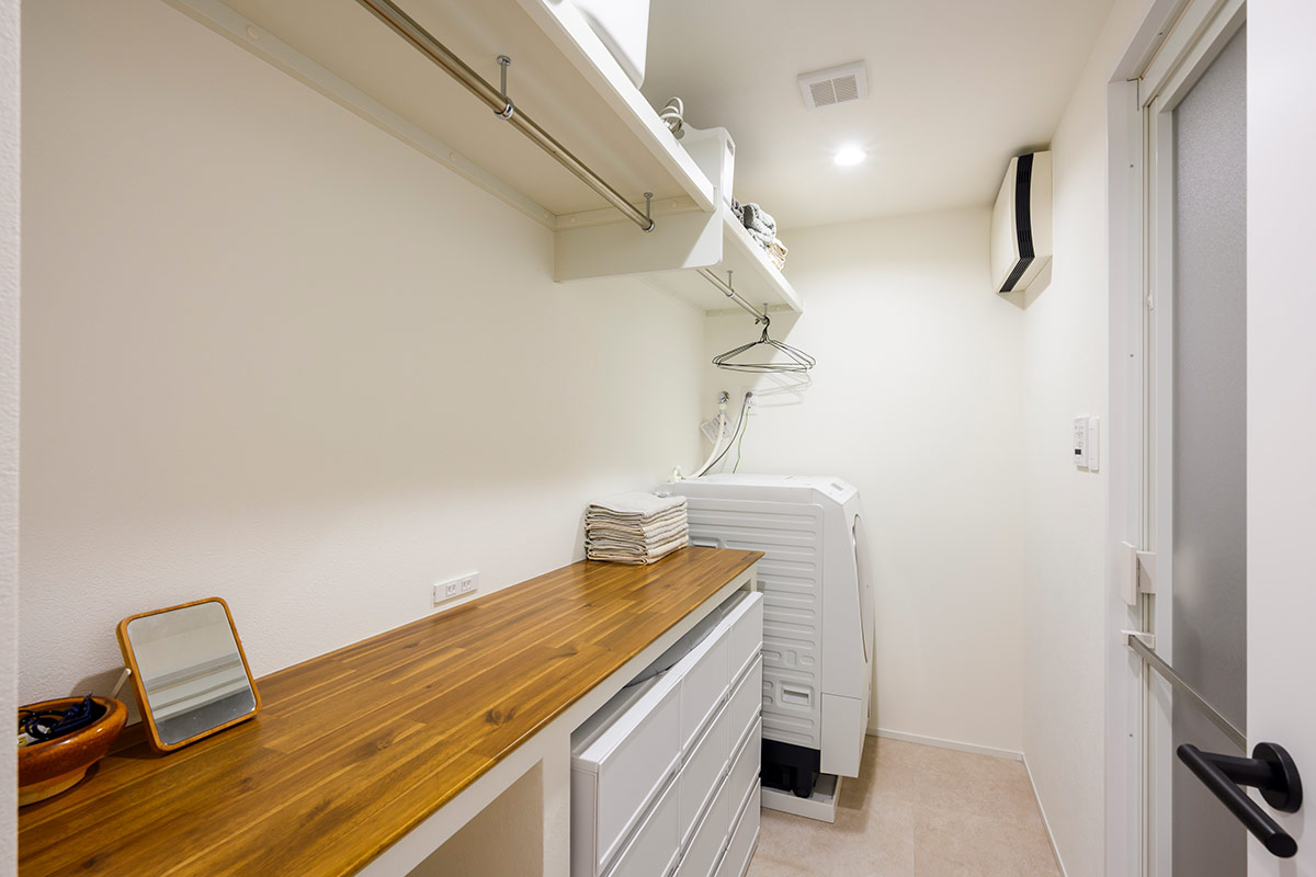 4人家族が快適に暮らせるよう、リビングに隣接した廊下部分に洗面スペースを設置。冷暖房が効いた空間で、快適に朝の準備ができそうです。脱衣室に広いカウンターを設置したことで、ランドリースペースとしても利用可能。ご夫婦のこだわりが、各所に詰め込まれたプランとなっています。