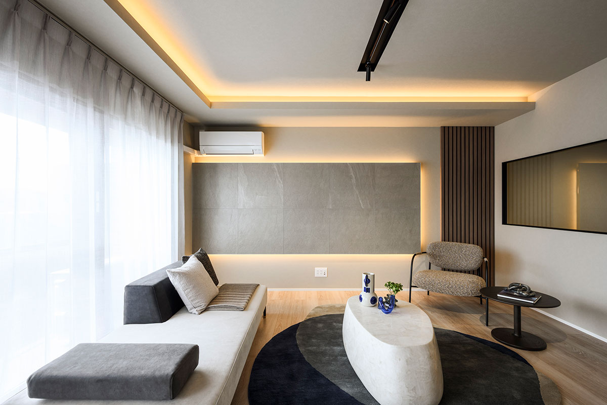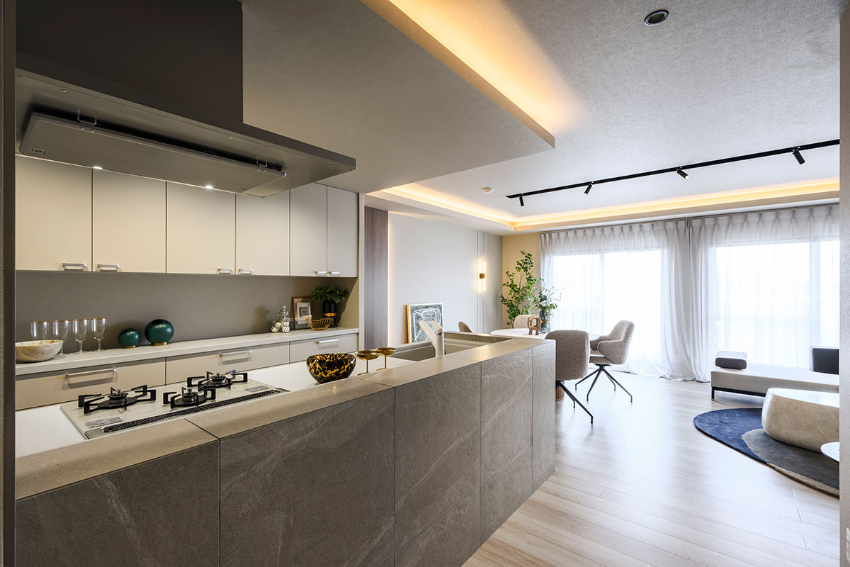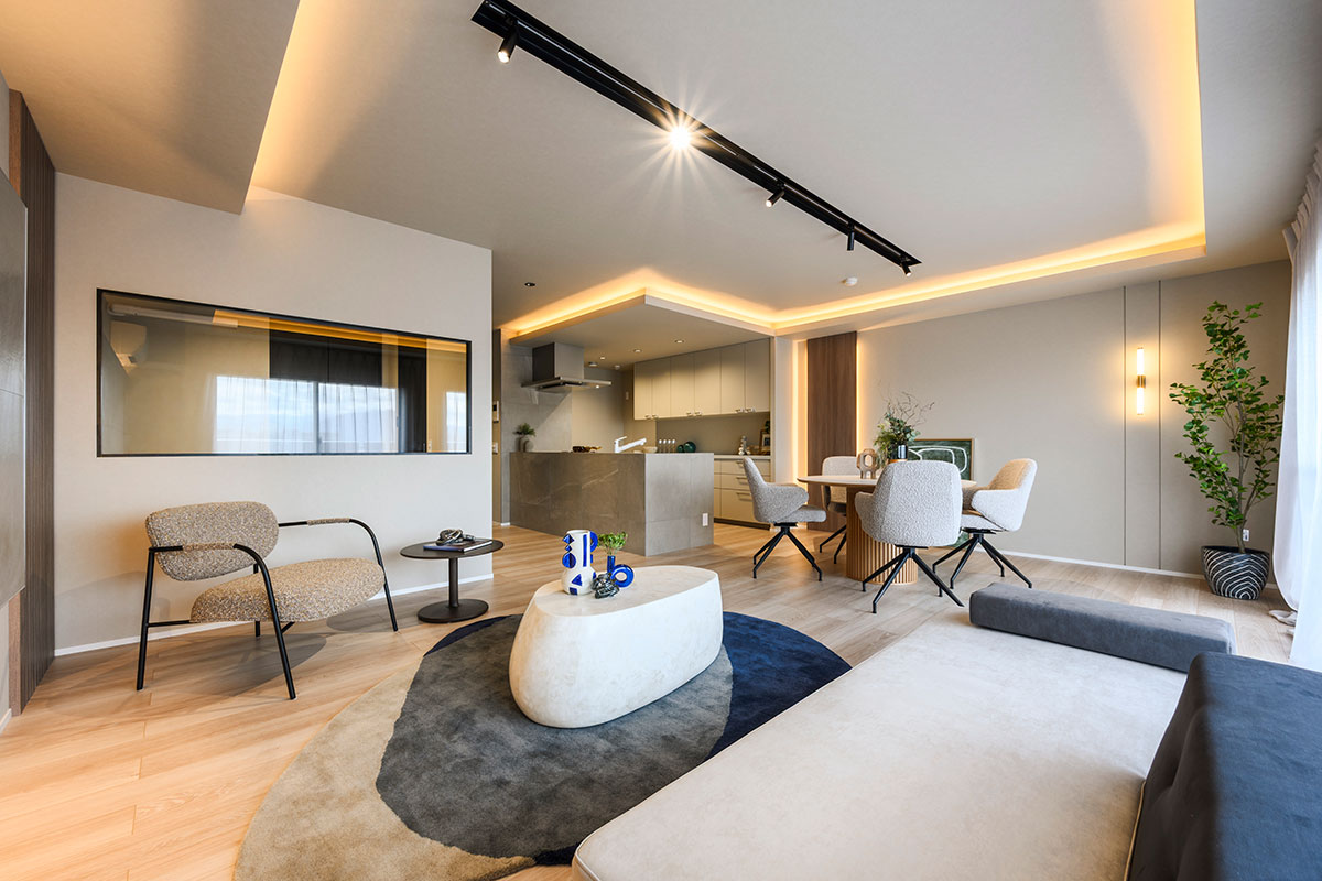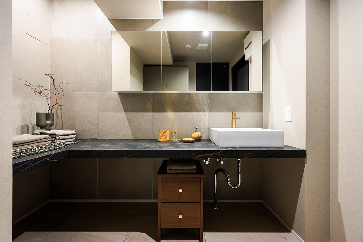 こちらの空間は富裕層向けのリノベーションに特化した「ハイエンド」と協業していることもあり、間取りだけでなく、仕様や細部にこだわったノイズレスな暮らしの場を実現しています。一見するとシンプルに見える空間ながらも、考え抜かれた色使いと美しさを意識した設計で、サイズ以上のゆとりと心地よさを感じさせます。