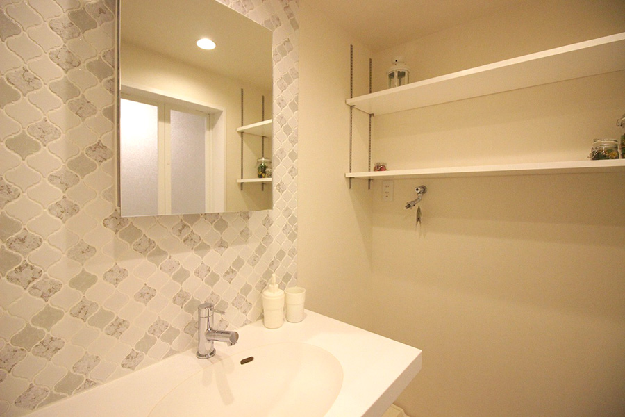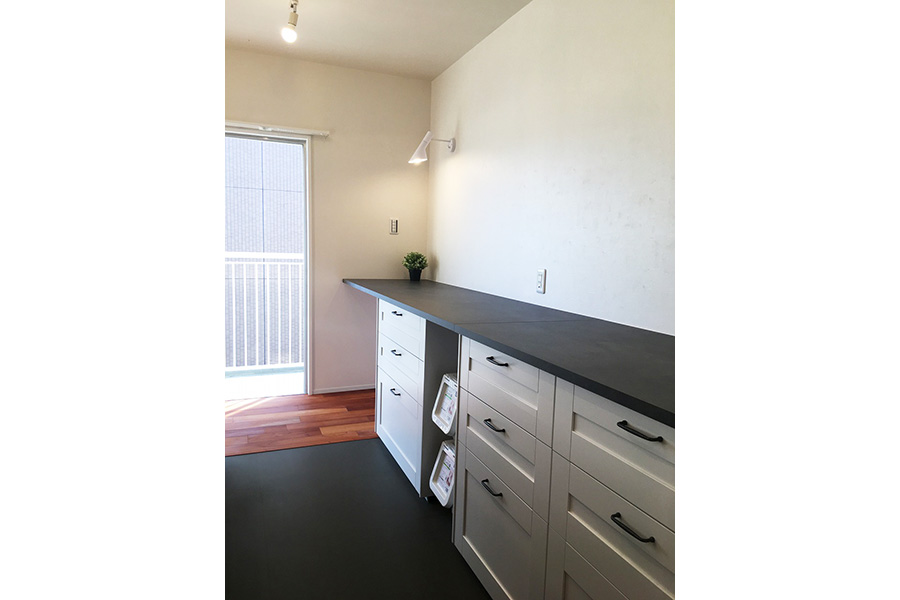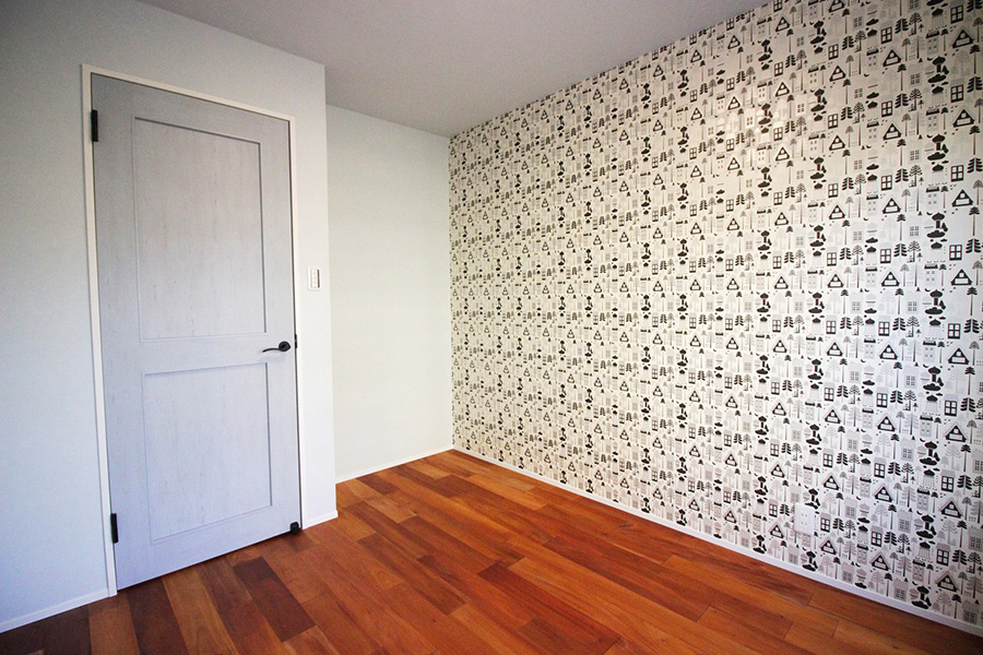 今回、床材にはサンワカンパニーのマホガニー系の無垢材を使用しています。しかも、乱尺(一つずつの長さが異なるフローリング材)を組み合わせたことで、とっても立体的な空間となりました。また、お家の中で一番のアイコンになっているキッチンは、背面の仕上げ(タイル)にこだわり、IKEA製のカップボードと組み合わせたことで個性あふれるキッチン空間となっています。