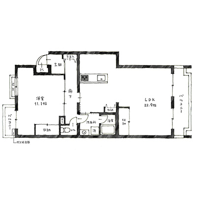 35年前は4LDKだったマンションを、これまでの入居者が少しずつ改装してきた結果、販売時点では1LDKの大空間へと生まれ変わっていました。
